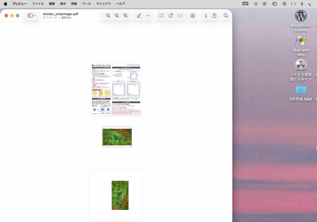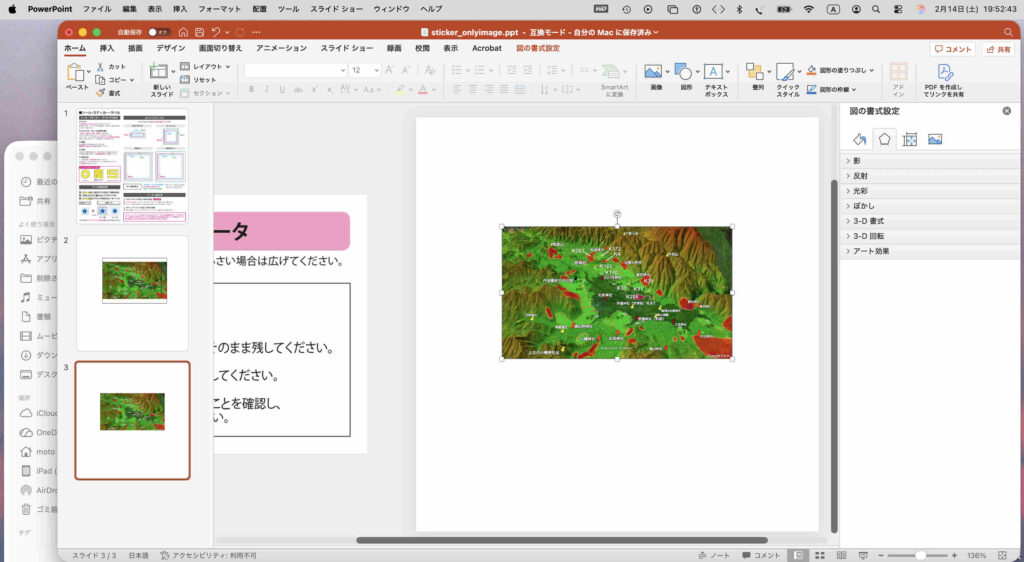 図3はパワポでの作業結果である。これをPDF出力したものを,macのプレビューで開いて,編集 > すべてを選択,そして,ツール > 時計回りに回転,すると,図4のように,3ページ目の画像だけが時計回りに回転する。