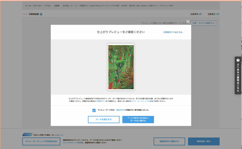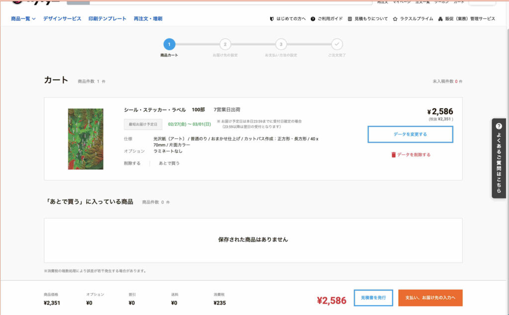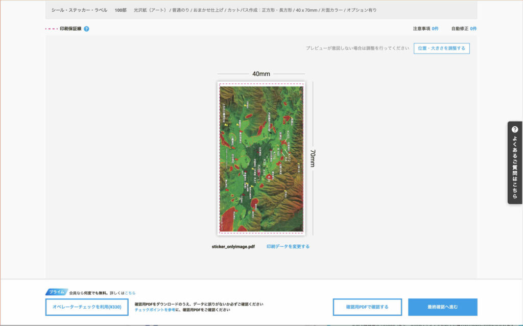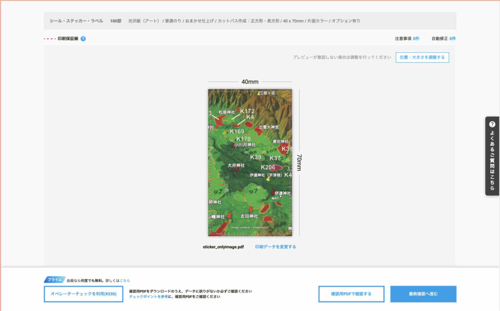 光沢紙(アート) シール印刷料金表から注文する。シールのサイズは,ぼくからすると,カットパスは長方形の70 mm x 100 mmか,40 mm x 70 mmなのだが,今回は一週間待ちにして,40 mm x 70 mmを選択した。