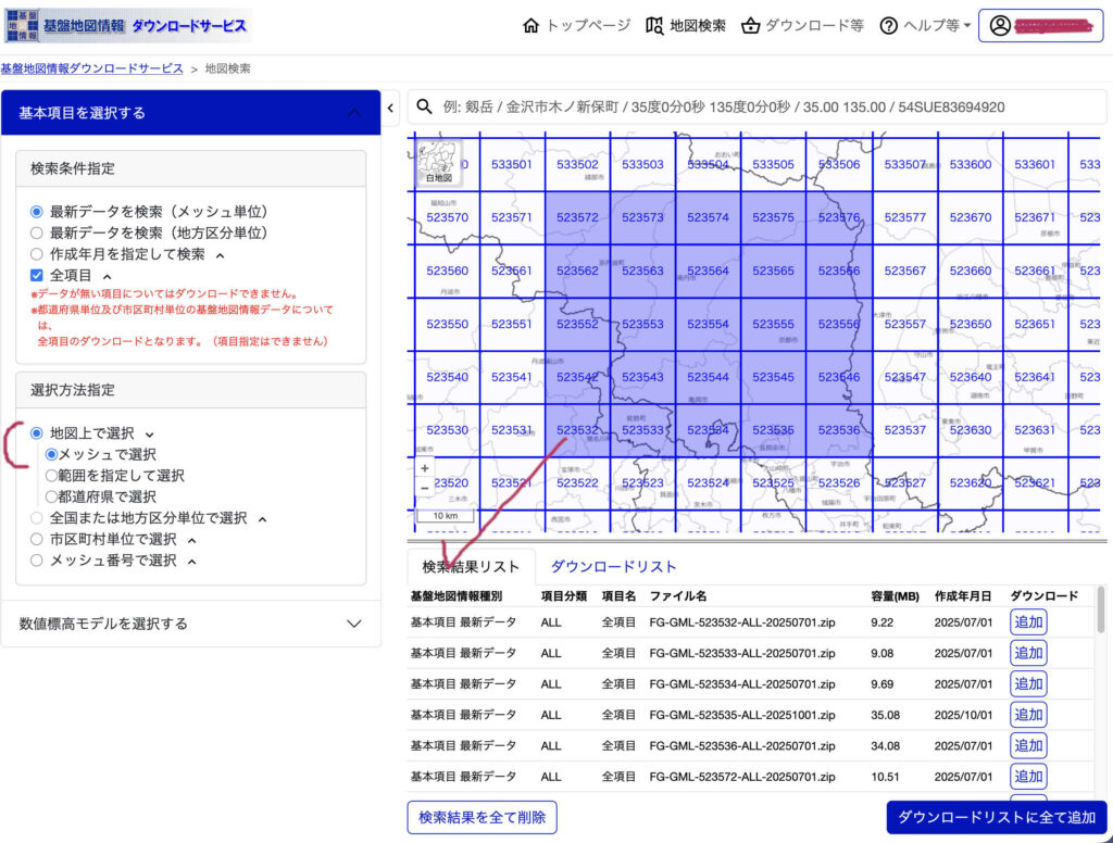 基本項目は実は次のDEMのダウンロードののちに実行して,妥当な方法をみつけた。図8のようである。メッシュ図のすぐ下に「検索結果リスト」が表示される。ただ,このリストはメッシュの配列順に必ずしもなっていないが,調べると,メッシュ図で選択したものと一致しているので,安心して問題はない。