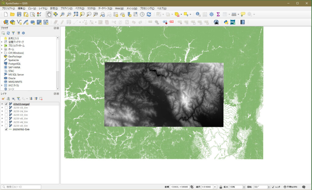 まずは、消えてしまったDEMレイヤーに対して「ラスタの投影変換(ワープ)」を試してみていただけますか?