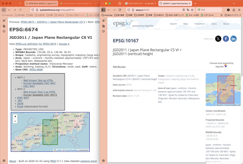 • WGS84 (EPSG:4326): 地球全体を基準にするため、地殻変動により日本国内では座標が毎年数センチずつズレます。