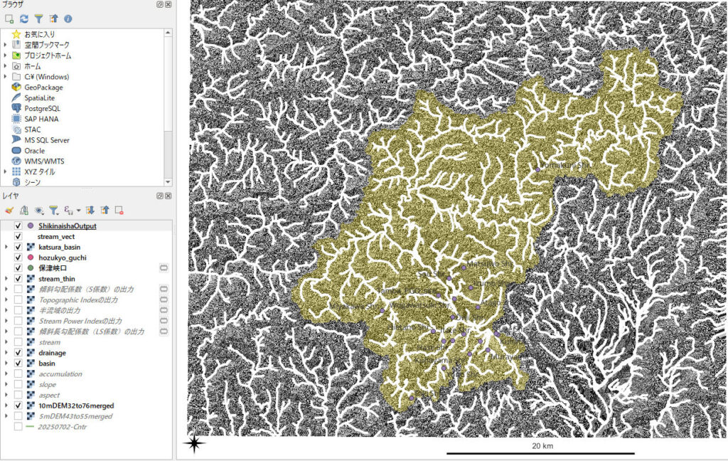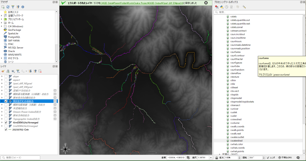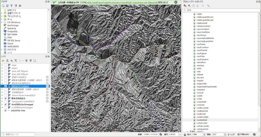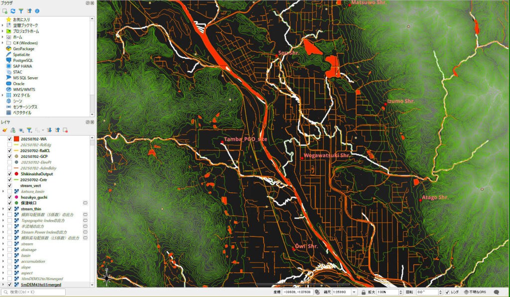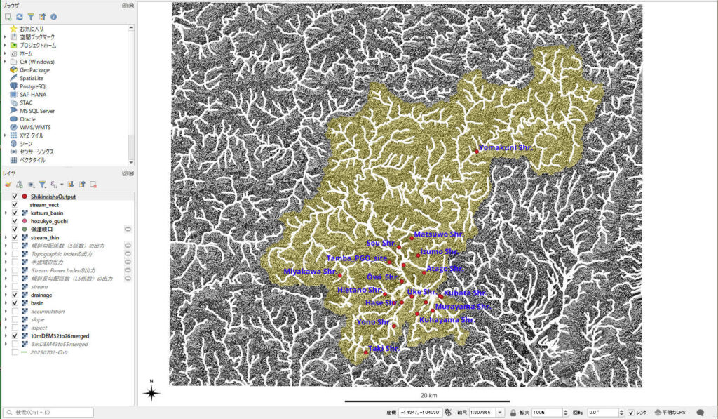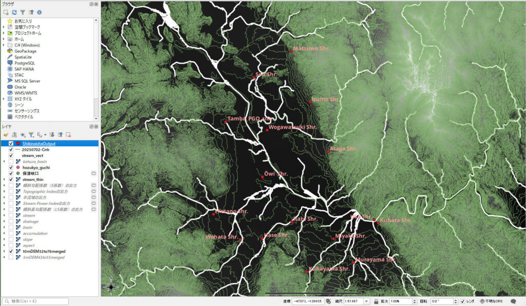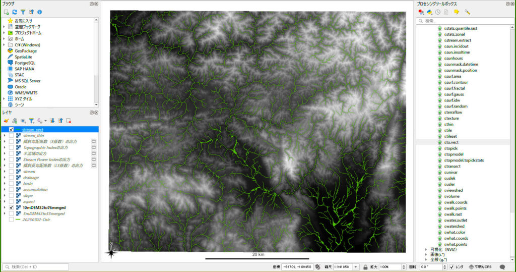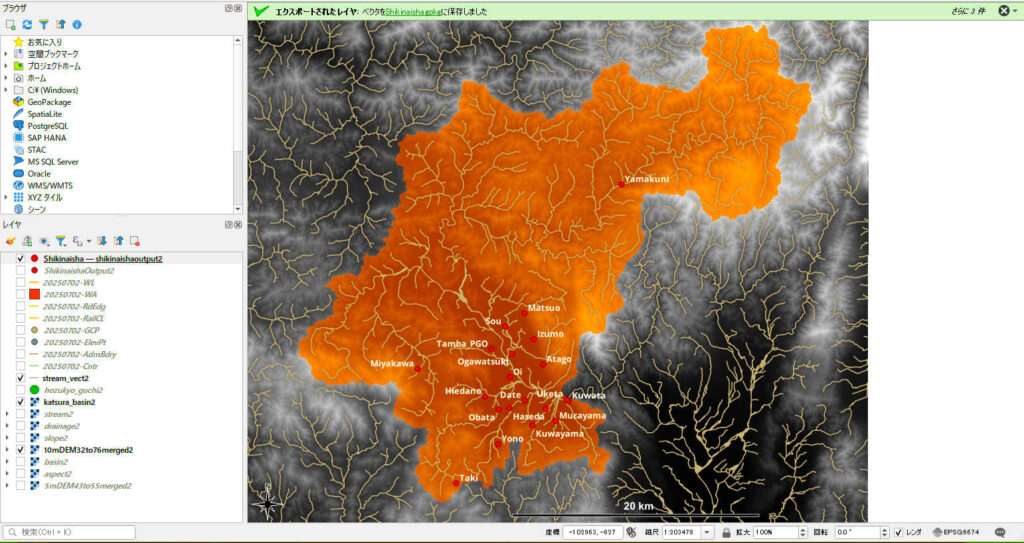 およそ,Geminiのサポートは有効であった。座標系の対応がqgis内でできた。ただ,新たな座標系EPSG:6674への変換後,カラー設定がうまくゆかない場合があった。accumulationラスターはどうしてもダメで元から廃棄した。今後,必要になれば,10mメッシュDEMから新たに作成する必要がある。